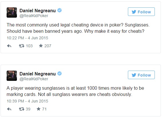 დენიელ ნეგრანუ უკვე დიდი ხანია თვლის, რომ სათვალის გამოყენება კაზინოში დაუშვებელია. ის თვლის, რომ სათვალის გამოყენება, ტრადიციული მიზეზით, უკვე 'ჩიტინგია', რადგან მოთამაშეს არ უნდა ჰქონდეს რაიმე ხელოვნური, დამხმარე საშუალებით თავისი ემოციების დაფარვის საშუალება.